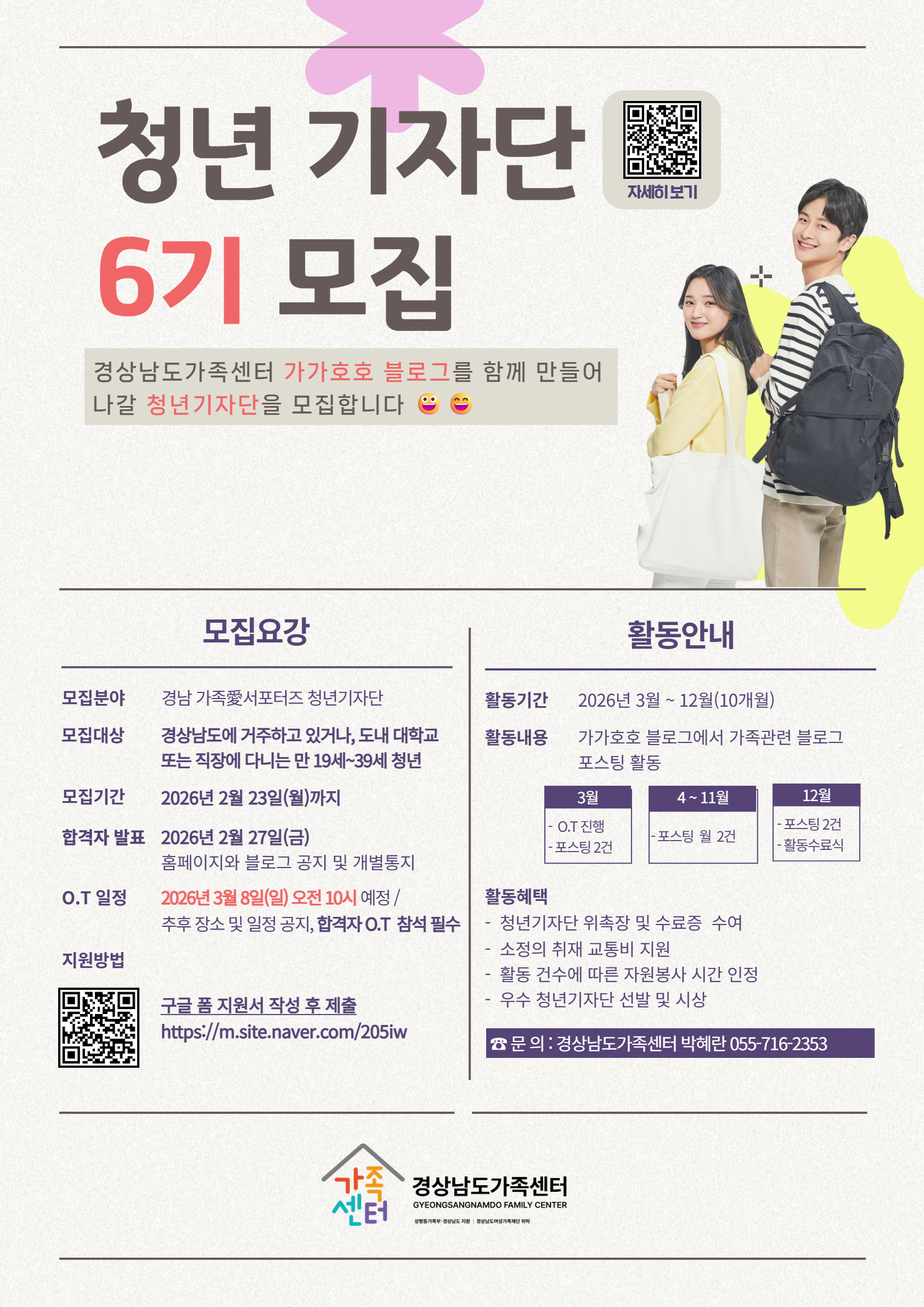 - 모집분야 : 경남가족애 서포터즈 청년기자단 6기