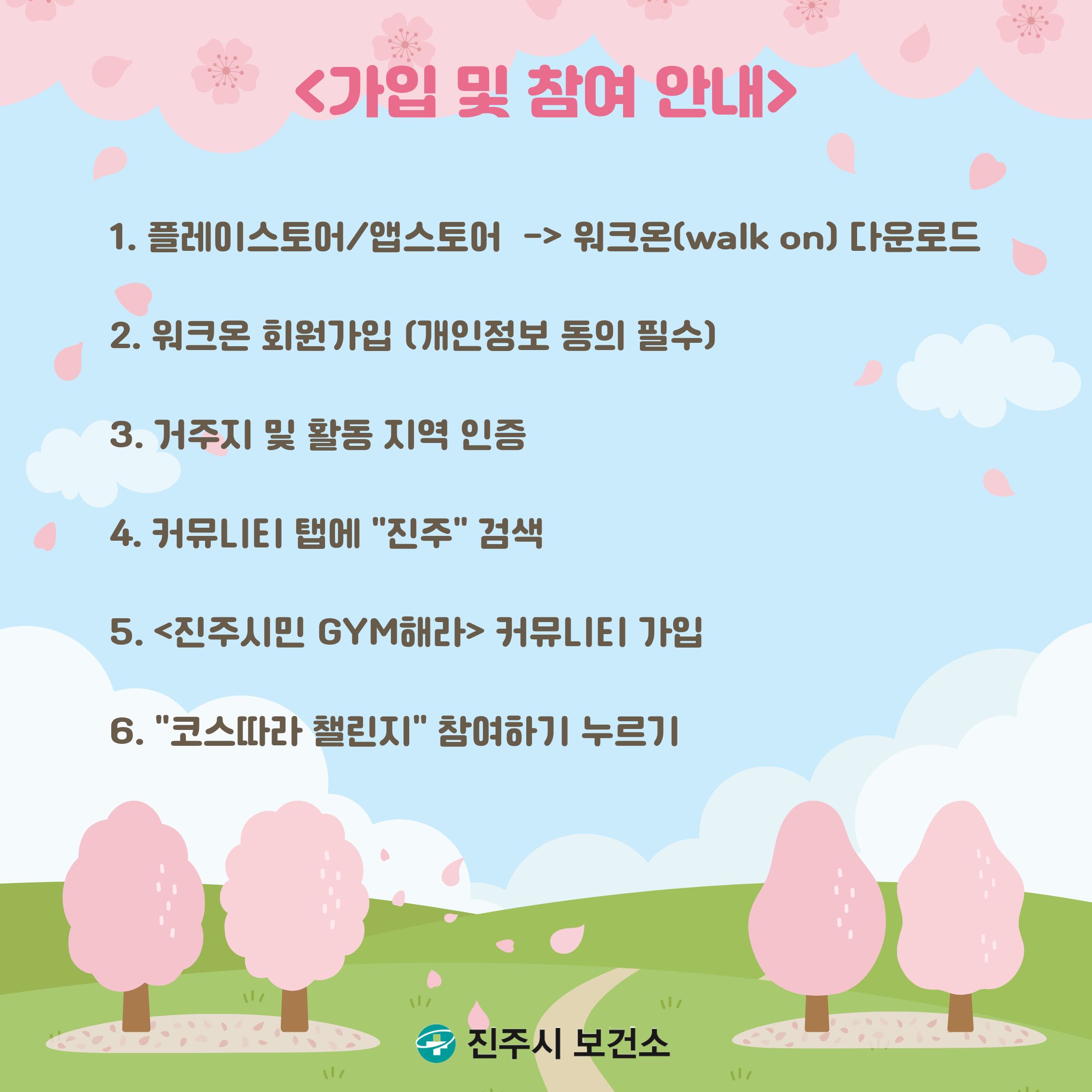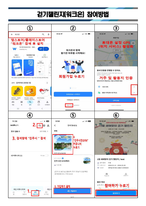 ○ 참여방법 : 워크온 앱 다운·회원가입 - 거주지 및 활동 지역 인증 - 커뮤니티 탭에서 검색창에 ‘진주’ 검색 - ‘진주시민 GYM해라’ 커뮤니티 가입하기 - 챌린지 참여하기